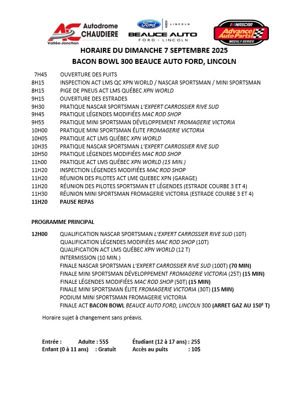 Beauce Auto Ford présentera samedi le 6 septembre dimanche le 7 septembre à l’Autodrome Chaudière, la 7e édition du Bacon Bowl 300. La crème de la crème sera sur place afin de se disputer la victoire et d’embrasser le traditionnel petit porcelet! La série ACT LMS Qc sera accompagnée pour l’occasion des Légendes Modifiées, Nascar Sportsman et Mini-Sportsman!